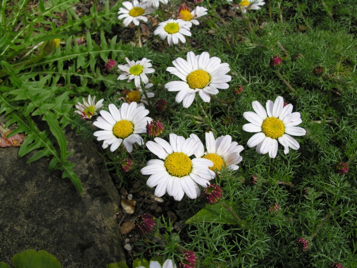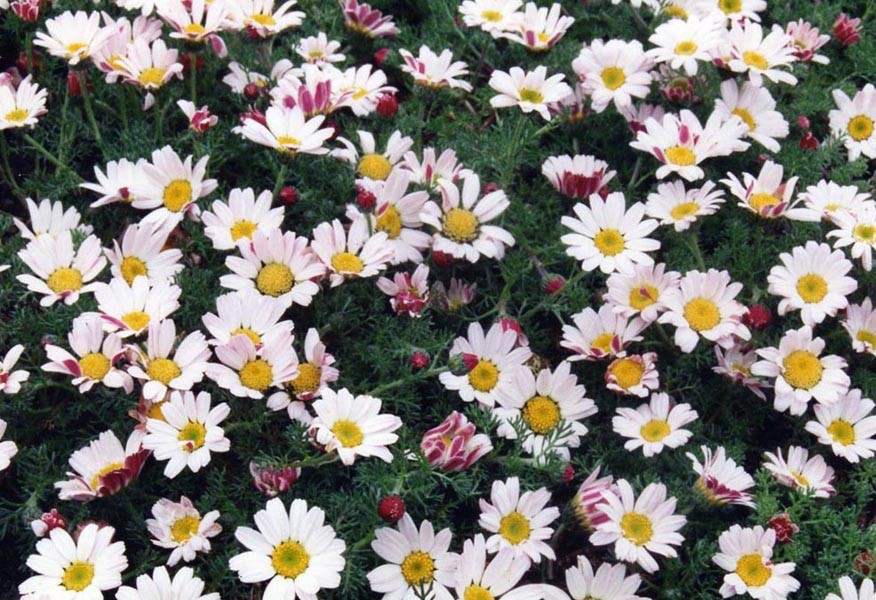 • мелкие цветы с желтой сердцевиной и белыми лепестками, обратная сторона которых имеет бордовую окраску. Растение, полученное из семян анациклюса, не вырастает выше 10 см. Это отличный почвопокровник с высокими эстетичными данными. На ночь и в дождь соцветия остаются закрытыми. Растение нуждается в большом количестве солнечного света. Для посадки рассады анациклюса подходит каменистая почва.
