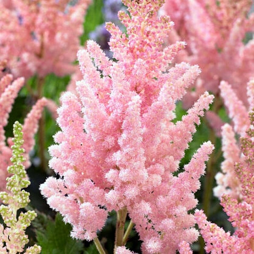 Саженцы Астильбы китайской Вижен Инферно (Vision Inferno) добавят цветнику изысканной нежности и легкости. В июле на небольших кустиках (высота не более 60 сантиметров) распускаются пирамидальные метелки бледно-розового оттенка. Крохотные цветочки в составе соцветий раскрываются по направлению снизу вверх, закрытые бутоны имеют светло-зеленый цвет. Таким образом, цветущая астильба, постепенно изменяет оттенок с зеленоватого на розовый. Сорт Вижен Инферно неприхотлив, отлично компануется с большинством растений с декоративной листвой на клумбе. С ярко окрашенными цветами многолетник лучше не высаживать, его нежная красота потеряется.