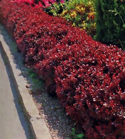 Саженцы кустарника барбариса Атропурпуреа нана (Atropurpurea Nana) – это карликовый подушковидный сорт, высота которого не превышает 60 см, а диаметр может доходить до 1 метра. Листья растения имеют яйцевидную форму и пурпурно-коричневый оттенок, появляются на ветках ранней весной. Осенью листья становятся ярко-красными. Цветки кустарника собраны в соцветия, они округлые желтые внутри и красные с внешней стороны, размер достигает 1см. Часто растение применяется в групповых насаждениях или в смешанных композициях, используется для формирования бордюров и живых изгородей. Отлично переносит стрижку и обрезки. Сорт Атропуупуреа нана высаживается на солнечные места и хорошо переносит несильную тень, но в тени листья сразу начинают зеленеть.