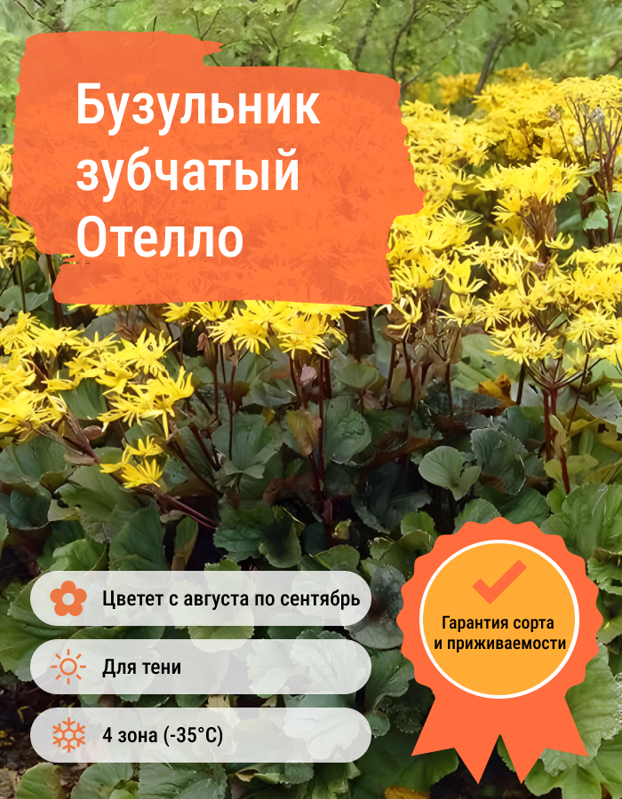 Рассада бузульника «Отелло» (Othello) способна украсить каждый участок. Она может вырасти в высоту до одного метра. Семена бузульника «Отелло» хорошо высаживать во влажную, удобренную почву. Место выбрать хорошо освещенное или полутень. В уходе растение не прихотливо. Только в период засухи оно нуждается в дополнительном поливе. Рассада бузульника «Отелло» хорошо разрастается. Цвести начинает в августе. По сентябрь на кустике красуются очень крупные (больше 10 см в диаметре) соцветия мандариново-оранжевого цвета. Листочки у растения тоже крупные. И в длину они могут достигать почти 50 см.