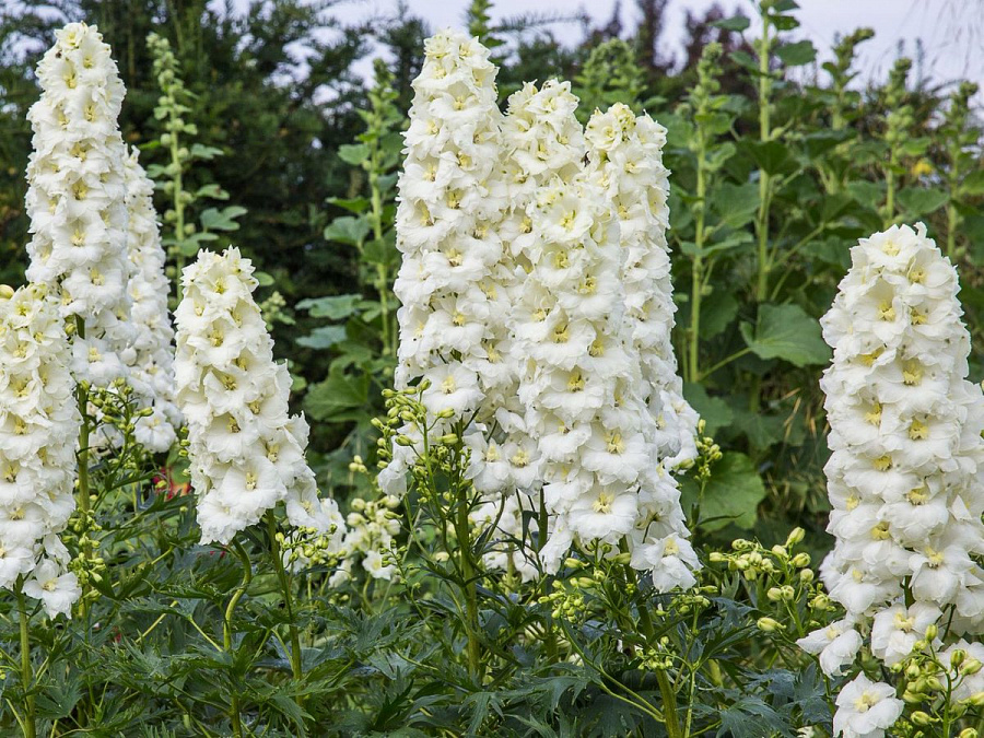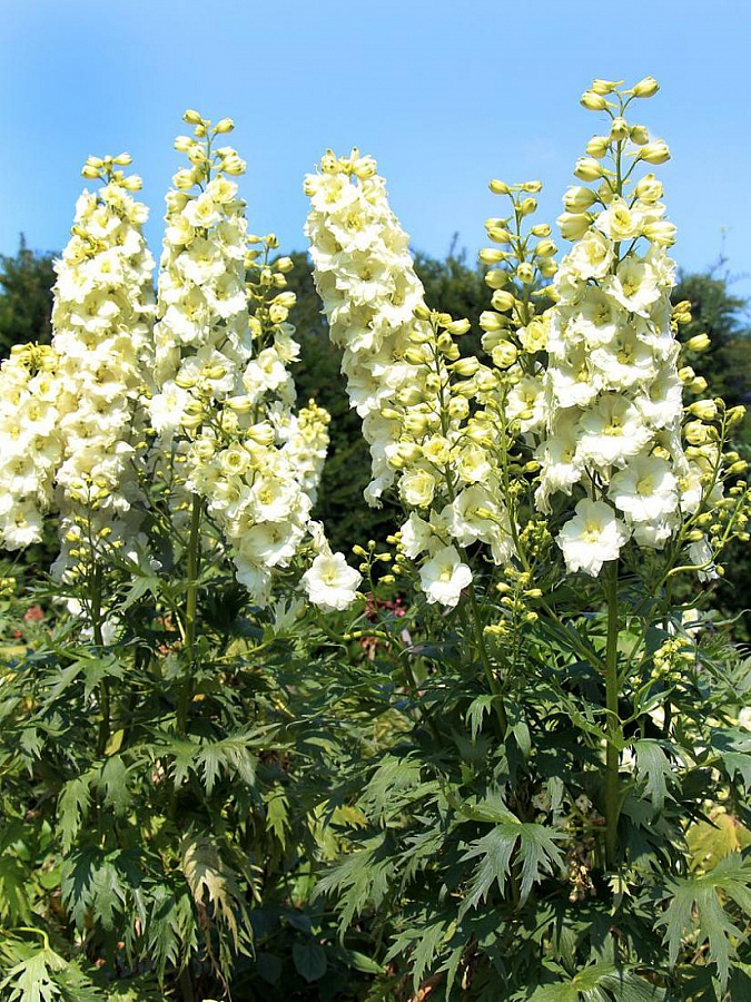 Рассада Дельфиниума высокого Санглим (Sungleam) производит отличное впечатление на садоводов профессионалом и любителей благодаря своим элегантным соцветиям кремово-белого оттенка. Если срезать цветы сразу после увядания, то Санглим будет цвести снова, но чуть позже. Такая рассада становится настоящим украшением для сада и, кроме того, её не понадобиться пересаживать ранее, чем через 10 лет. Из-за мощной корневой системы побеги цветка вырастают до 1,5 метров, из которых 50 – 70 см составляют соцветия. Каждое соцветие состоит из достаточно крупных цветков до 7 см в диаметре. Располагать этот сорт лучше на участках с хорошим освещением и в легкой тени при условии хорошей защиты от ветра. Он лучше развивается на свежей глинистой почве.