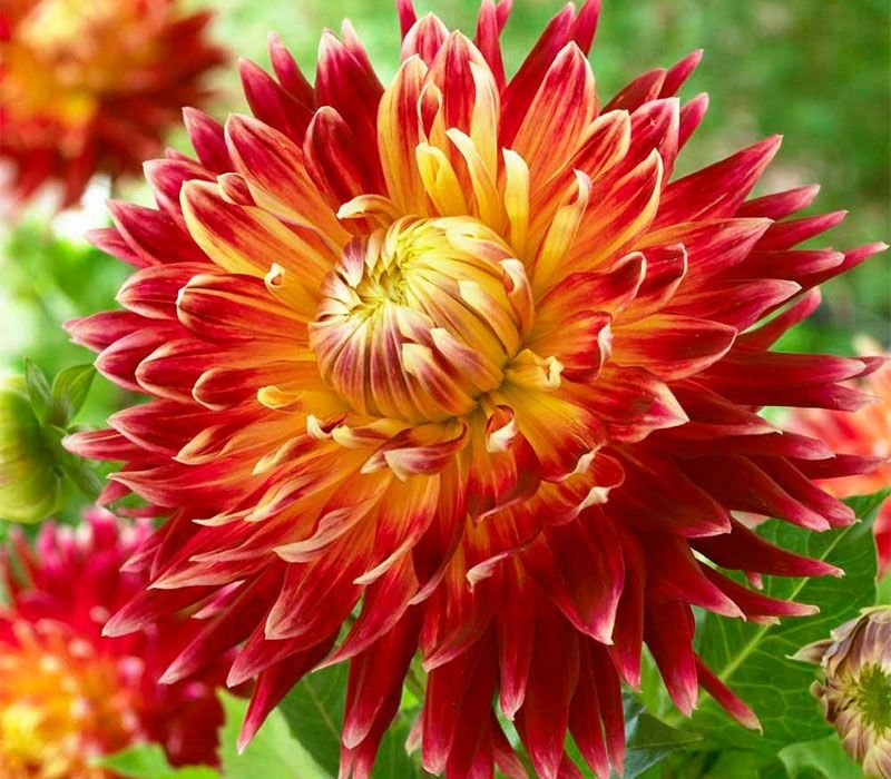 Клубни георгины махровой Акита (Dáhlia variabilis Akita) позволят вырастить на приусадебном участке куст, который с июля по сентябрь будет радовать цветами диаметром от 10 до 12 сантиметров. Цветы поражают необычной расцветкой. Основной тон лепестков красный, края украшены едва заметной белой каймой. Поэтому издали кажется, что они покрыты серебристым налетом. Высота куста достигает от 60 до 100 сантиметров. Растения высаживают одиночно или группами, их используют для создания миксбордеров. Кусты подвязывают к опоре, иначе стебли могут падать на землю под тяжестью цветков.