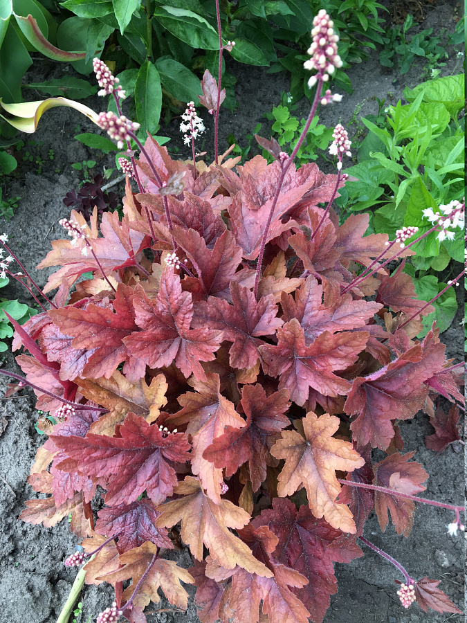 Рассада гейхереллы Редстоун Фоллз (Redstone Falls) наполнит ваш сад яркими красками. Листва многолетника окрашена красными, персиковыми, коричневыми и розовыми тонами. Особенно эффектно кусты выглядят летом, когда на них распускаются белые цветочки. Этот сорт используется для украшения клумб, наполнения бордюров и оформления альпийских горок.