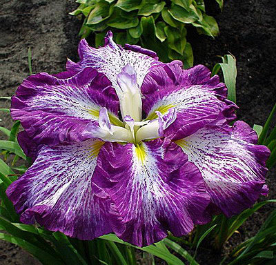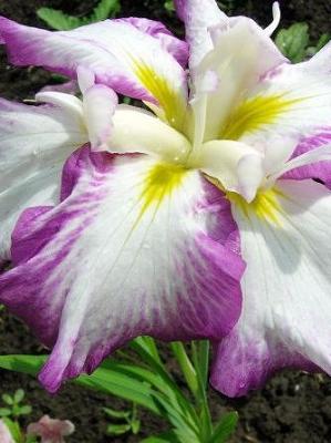 Ирис японский несса-но-мей - это великолепное растение с темно-сиреневыми цветками, украшенными крупными белыми прожилками. Его стебель достигает высоты до 75 см, что делает его заметным акцентом в саду. Листья ириса имеют изящную форму, придающую растению особый шарм.