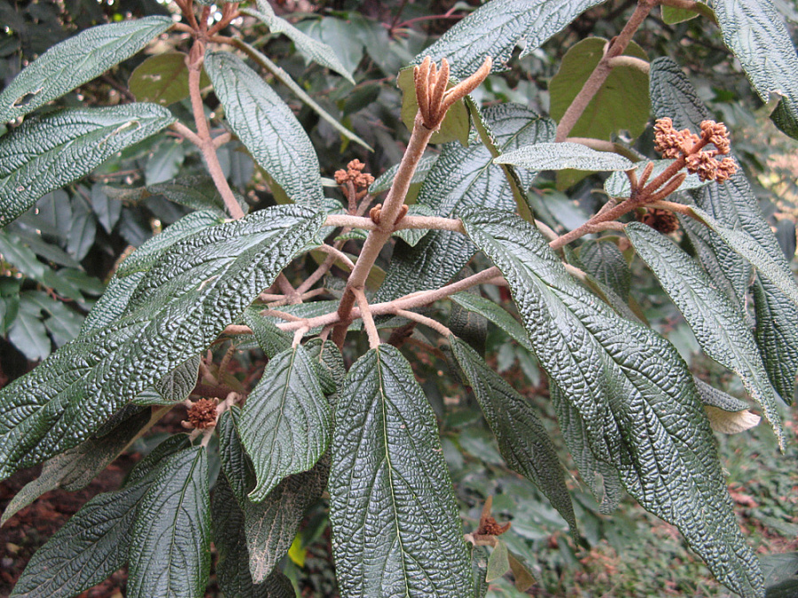 Саженцы калины морщинистолистной (Viburnum rhytidophyllum) вырастают раскидистым кустом с крепкими, прочными стеблями. Листва крупная, темно-зеленого тона, широкая и морщинистая. Цветет небольшими, белыми цветочками, которые собраны в пучкообразные соцветия. Достоинства калины морщинистолистной: