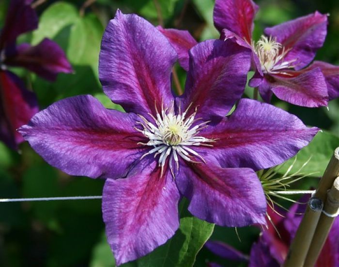 Клематис Rasputin - вьющееся декоративное садовое растение, достигает высоты 2.0 – 3.0 м. Цветки диаметром 8-12 см, очень тёмные пурпурно-фиолетовые, с обратной стороны светлые, серо-фиолетовые. Лепестки с волнистыми краями. Тычинки с пурпурными пыльниками на зеленоватых тычиночных нитях. Период цветения: июнь-сентябрь. За опоры цепляется листовыми черешками. Можно выращивать у решёток, колышков и других садовых опор, также может карабкаться по натуральным опорам (лиственным либо хвойным кустарникам, а также полукустарникам). Красиво смотрится на светлом фоне. Пригоден для выращивания в контейнерах.