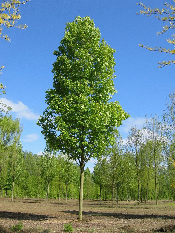Саженцы клёна красного Сканлон (Scanlon) хорошо подходит для озеленения разных территорий, высадки вокруг водоёмов. Крона до 10-12 м высотой и 3-4 м в диаметре, узкоколоновидной формы. Листья весной имеют красноватый оттенок, летом зелёные с беловато-сизым окрасом изнанки, к листопаду окрас меняется на жёлто-оранжевый или почти красный с оттенками. Морозоустойчивость высокая, но при холодных ветрах возможно обмерзание молодых побегов. Хорошо выносит городские условия. При необходимости возможно приобретение крупномеров клёна красного Сканлон.