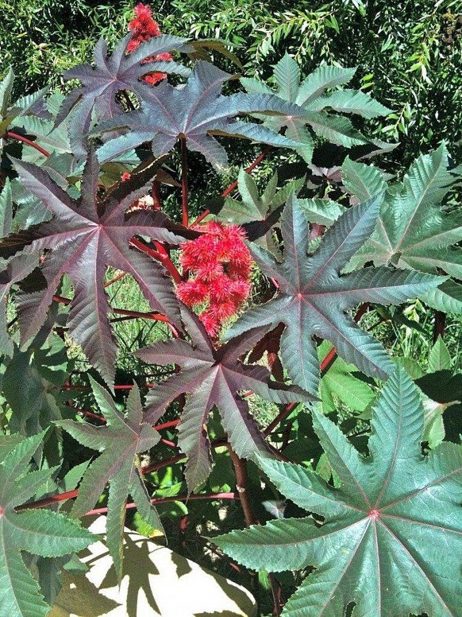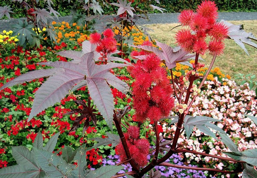 • маскировка бытовых строений и так далее. Рассада клещевины произрастает из шаровидных семенных коробок с прочной оболочкой и шипами. Эти своеобразные плоды весьма ядовиты, поэтому следует беречь детей от контакта с ними. Для посадки семян клещевины подходят солнечные участки плодородной почвы. Растению необходимо обеспечить защиту от ветра.