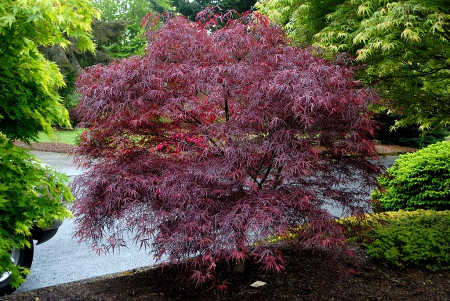 Саженцы Клёна веерного Тромпенбург (Trompenburg) – небольшое деревце или крупный куст, высота которого достигает 7 метров. Листья необычные: каждый рассечен на 7 или 9 лопастей, растопыренных по кругу, где каждая лопасть будто выгнута. Сначала, листья ярко-пурпурного цвета, летом они приобретают слегка зеленоватый оттенок, а к осени становятся насыщенно-багряными. Клён веерного Тромпенбург нуждается в теплом месте, возможна тень, а вот от ветра дерево стоит поберечь. Почва необходима плодородная, богатая минеральными веществами, достаточно влажная. Песчаный суглинистый грунт также возможен, необходим дренаж. К низким температурам устойчив в меру.