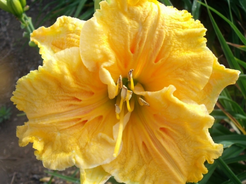 Лилейник Бас Релиф (Bas Relief)- многолетнее растение прекрасное по своим декоративным качествам. В период с июня по август формирует золотистые цветы с зеленым горлом. Лепестки гофрированные, скульптурные по центру имеют рельеф в виде пера. Лилейник хорошо зимует под снегом, не требуя дополнительного укрытия. Для посадки выбираем хорошо освещаемые солнцем места. Застоев воды растение не переносит, особенно в холодное время года.