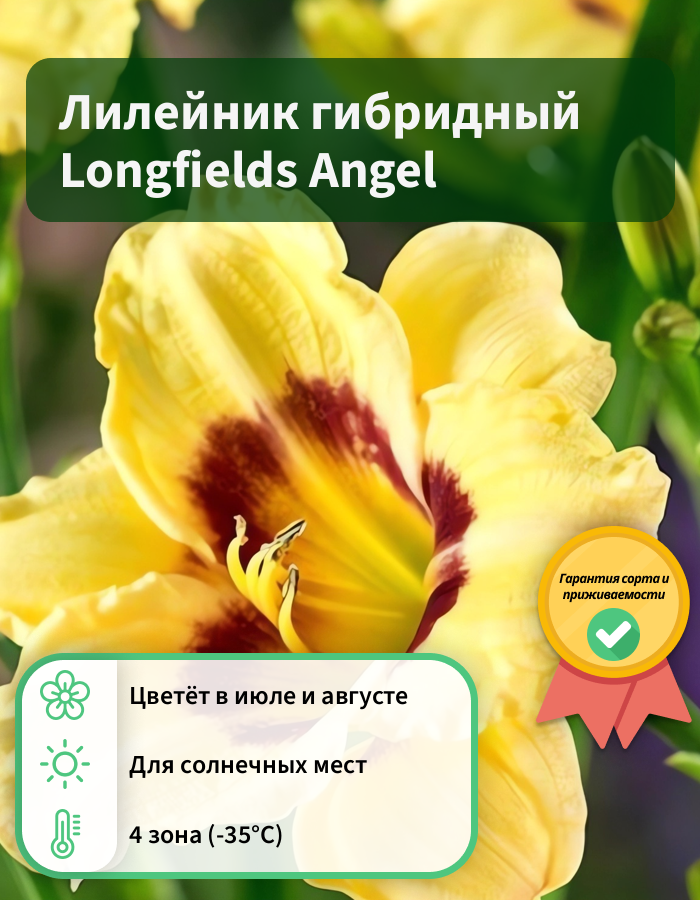 Лилейник гибридный Longfields Angel (Лонгфилдс Энджел) - компактный лилейник с максимальной высотой до 60 см, способный цвести повторно. Цветки диаметром 10 см появляются к июлю. Лепестки гофрированные, кремового оттенка с пурпурно- красным глазком над зеленовато- желтым горлом. Имеет легкий аромат. Лонгфилдс Энджел является морозоустойчивым неприхотливым сортом. Сохраняет свою привлекательность в течении всего сезона.