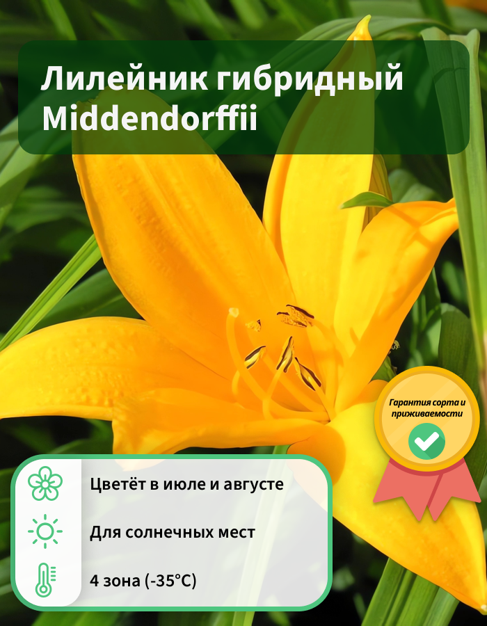 Рассаду лилейника гибридного Middendorffii можно использовать для оформления сада или выращивать на срезку. Кусты с крупными золотисто-желтыми цветами будут отлично смотреться на клумбах, рабатках, бордюрах, на берегах декоративных водоемов. Растения хорошо переносят неблагоприятные условия, поэтому их можно размещать в городских парках, скверах и рядом с объектами инфраструктуры. Посадив рассаду лилейника гибридного Middendorffii, вы сможете любоваться непрерывным цветением с июля до августа. Растения обладают устойчивостью к заболеваниям и низкой температуре, поэтому не нуждаются в зимнем укрытии.