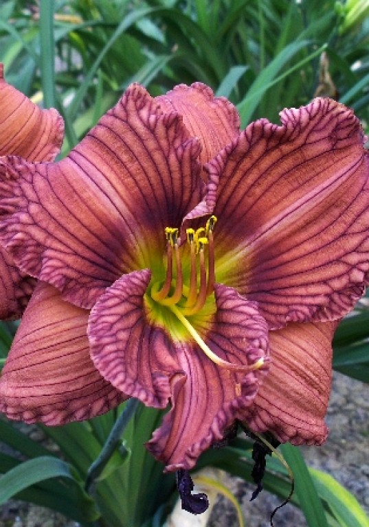 Цветок лилейника Новеа ту Хайд необычного розовато-коричневого оттенка с небольшим лимонным горлом и фиолетовым глазком. Вся поверхность гофрированных лепестков испещрена темно-фиолетовыми прожилками. Период обильного цветения приходится на июль, возможно повторение осенью.