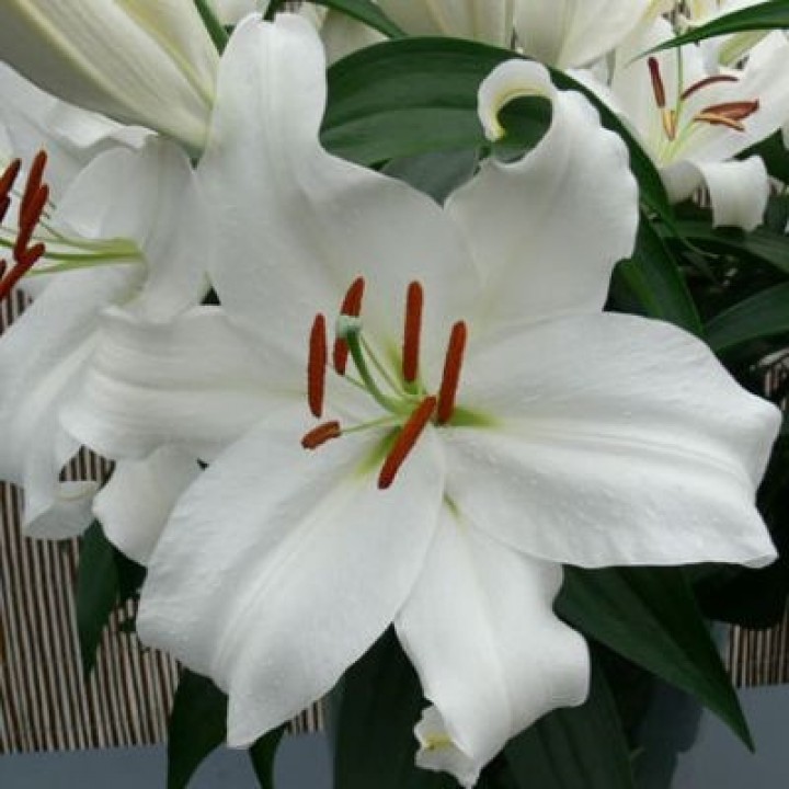 Лилия восточная горшечная фри чойс - это изысканное растение, которое поразит вас своей красотой и изяществом. Ее стебель достигает высоты до 45 см, а цветки белого цвета с зеленцой у основания и волнистыми краями радуют глаз размером до 15 см. Летом листва этой лилии приобретает темно-зеленый оттенок, что создает прекрасный контраст с яркими цветами.