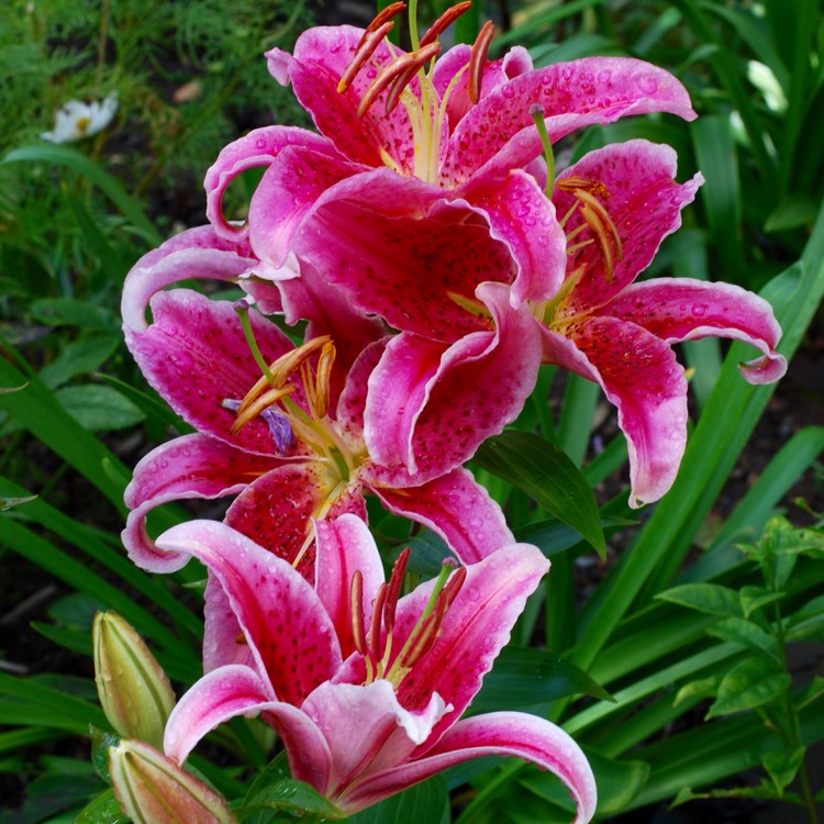 Луковицы лилии восточной Старгейзер (Stargazer) – сорт, названный звездочетом за лимонные прожилки, образующие звезды на лепестках ярко-розовых цветов. Каждый побег вмещает десятки соцветий и образует полноценный букет. Лепестки насыщенного оттенка с белой каймой слегка загнуты наружу и покрыты темными «тигровыми» пятнами.