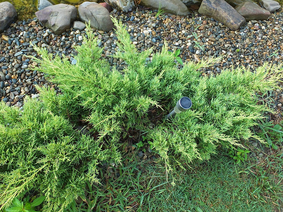Саженцы можжевельника Пфитцериана Голден Сауке (Golden Saucer), который относится к стелющимся сортам этого растения, хорошо приживаются. С возрастом концы побегов немного приподнимаются, образуя характерную крону-блюдце. В период роста хвоя имеет светло-зеленый оттенок с золотыми переливами.