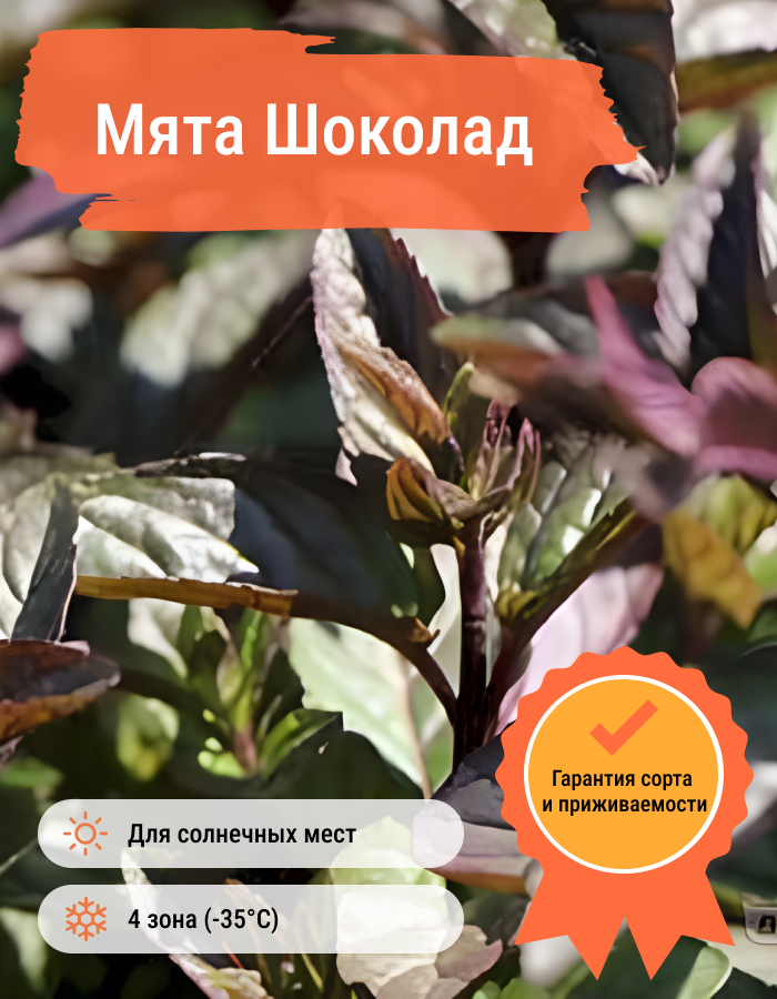 Рассада мяты «Шоколадная» (Méntha) свето- и влаголюбива, растет практически на всех грунтах. В морозные зимы нуждается в легком укрытии. В высоту достигает 30-60 см. Листья темно-зеленые, с багровым оттенком, богаты антоцианами. В августе многолетник начинает цвести небольшими лавандовыми цветочками, которые собираются в метелки. Листву и соцветия мяты «Шоколадная» используют как добавку к пище: выпечке, напиткам и мороженому. Ароматные листики украсят десерт, придадут салатам и лимонаду необычный вкус.