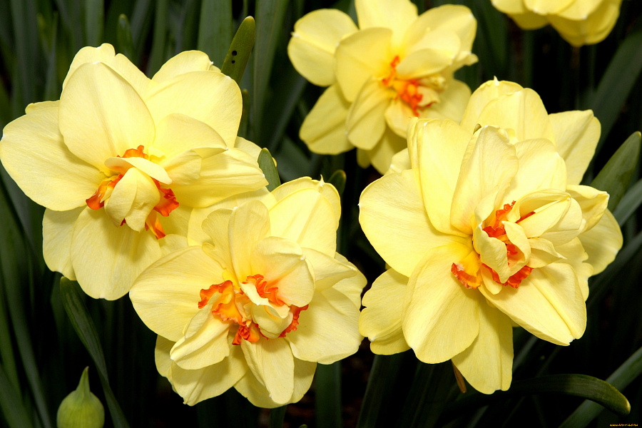 Луковицы нарцисса Ascot могут с успехом расти не только на солнечных открытых места, но и в полутени. В полную тень их сажать не стоит, поскольку тогда цветок будет очень мелкий и потеряет свои декоративные качества. Почва для луковиц нарцисса Ascot подходит любая, но хорошо дренированная. Крупные махровые светло-желтые цветы с тремя рядами лепестков раскрываются в начале апреля. Период цветения длится до середины мая. Желтые лепестки перемешаны с ярко-оранжевыми, гофрированными некрупными лепесточками коронки. Смотрится такой цветок очень нежно, будто стая бабочек.