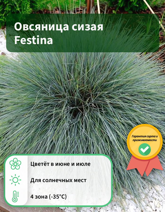 Рассада овсяницы Фестина (Festina) вырастает аккуратным, пышным кустиком около 60 см в высоту. Листики узкие, длинные, линейные и имеют сизо-зеленый окрас. Листва собрана в прикорневую розетку. Цветет серо-зеленым цветением, которое образует мягкие метелки. Плюсы овсяницы Фестина: - высокая декоративность - компактный вид нужен минимальный, несложный уход Рассаду овсяницы Фестина выращивают в солнечных местах с песчаной почвой. Желательно поливать в жаркую погоду. Применяется для каменистых садов, альпинариев или миксбордерах. Красиво смотрится в качестве живого бордюра или в смешенных цветочных клумбах.