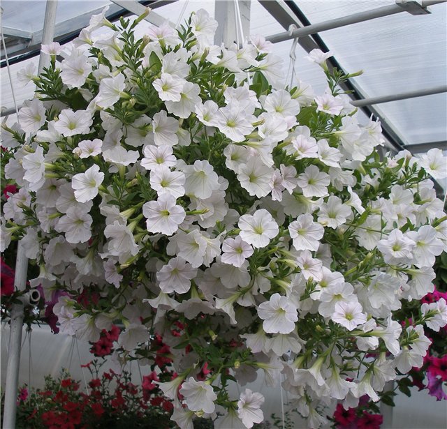 Петуния ампельная опера белая - это изысканное растение, которое поразит вас своей нежной красотой и изысканным ароматом. Ее стебли гибкие и изящные, способные создать удивительный зеленый ковер, украшенный множеством белоснежных цветков диаметром до 5-6 см. Листья петунии ампельной опера белой имеют форму овала, что придает растению особую изящность.