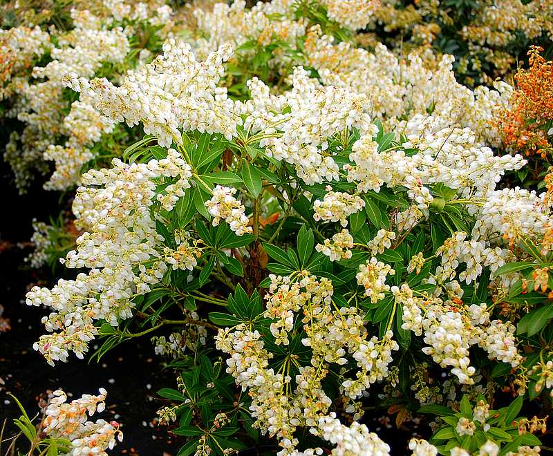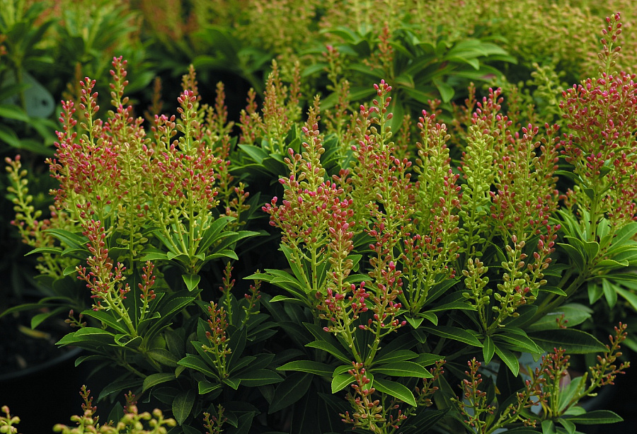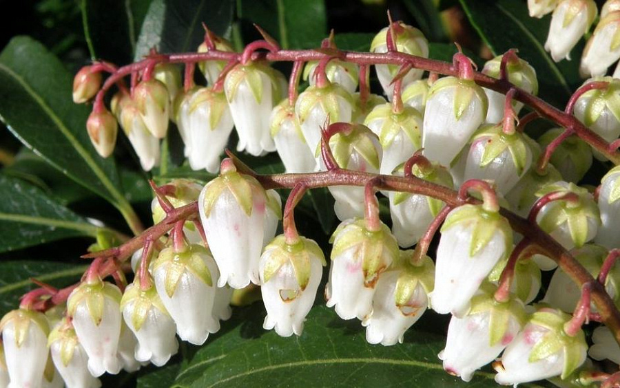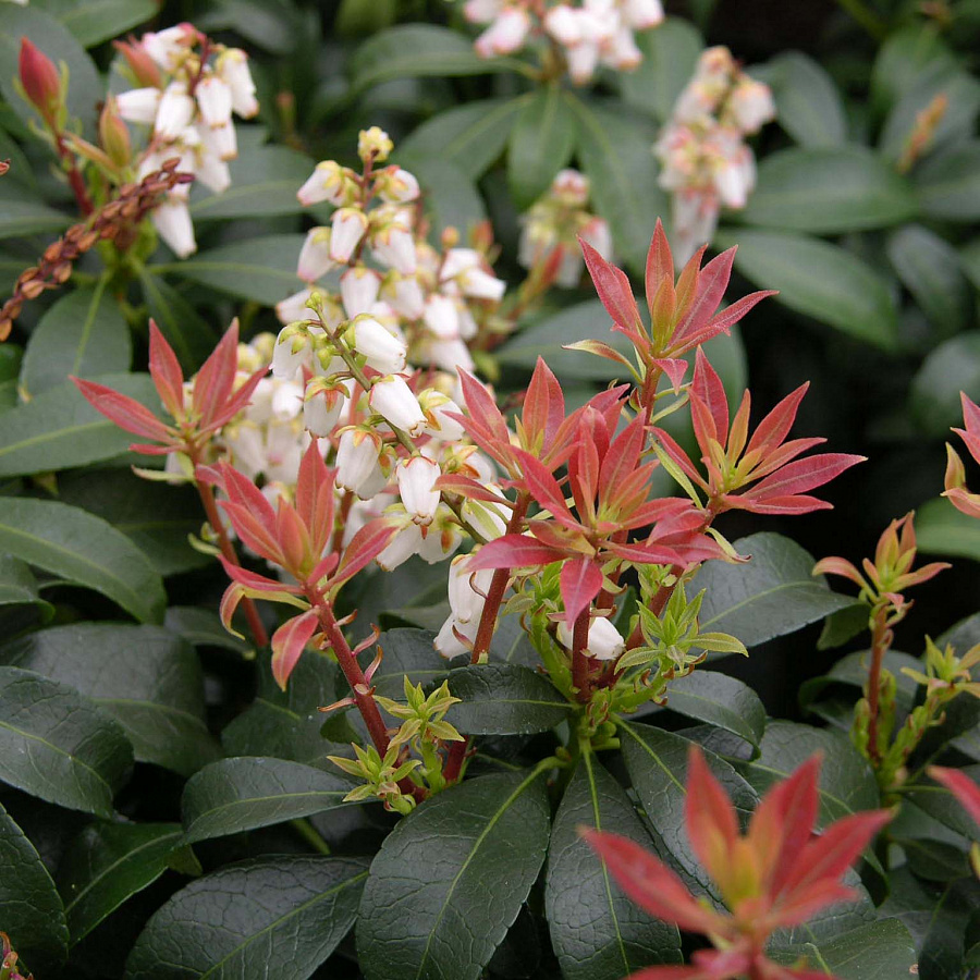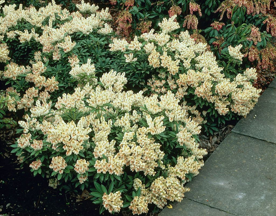 Саженцы Пиериса японского Дебютант (Debutante) – кустарник, который ценят не только за красоту, но и за медленный рост. Максимальный размер полтора метра, причём размер одинаковый, что в высоту, что в длину. У молодых растений кора гладкая, у более старых – отслаивающаяся полосками. Глянцевые листики красиво отражают цвет. В сезон кустарник покрывается белоснежными цветами, и украшают сад до конца апреля. Затем на ветках появляются тёмные ягоды. Этот вид пиериса имеет плоские корни, которые располагаются близко к поверхности. Чтобы кустарник хорошо перенёс зиму, следуют мульчировать землю листвой.