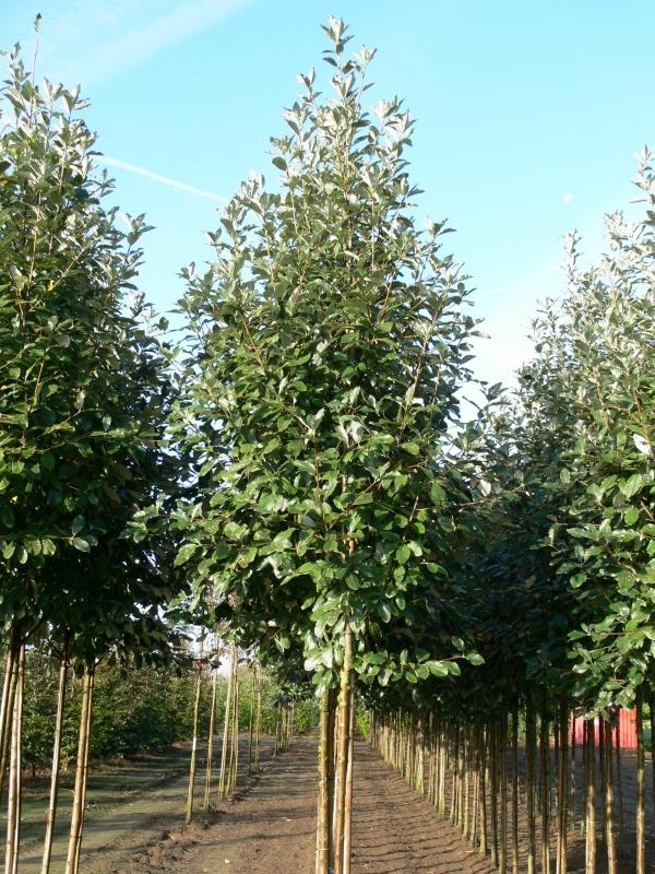 Саженцы Рябины ария Магнифика на штамбе (aria Magnifica) – изысканное стройное дерево, высота не превышает 10 метров. Молодое растение имеет крону-сферу, а с возрастом она вытягивается вверх. Новые веточки белые, словно покрыты бархатом, со временем опушенность уходит, а оттенок становится коричневым и даже красным. Листочки округлые, сперва имеют очень светлый цвет, а постепенно, по мере роста наливаются зеленью. В Осеннего период крона становится бронзовой.