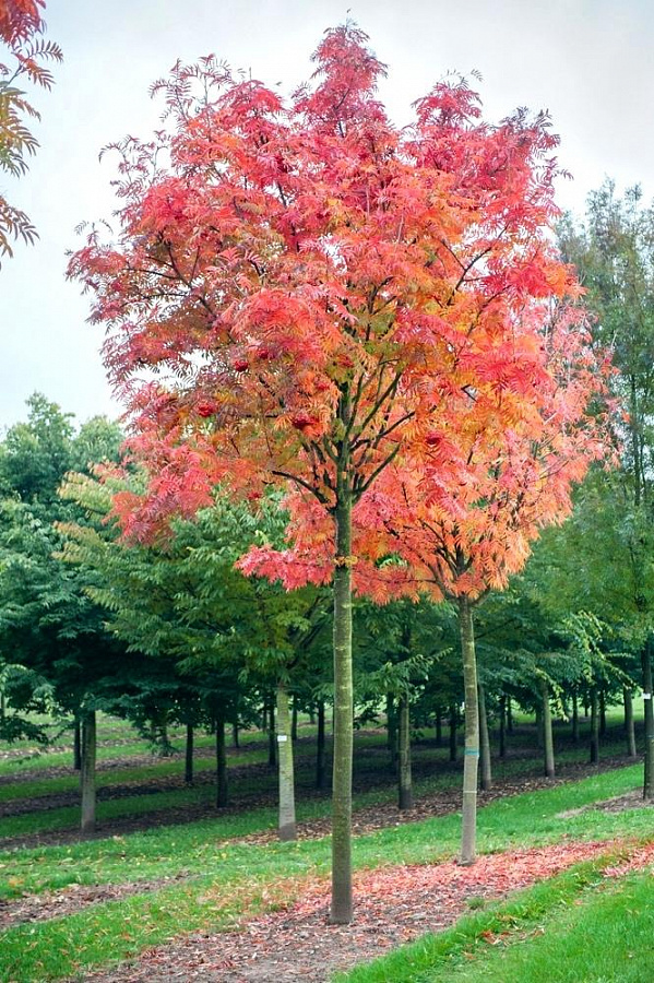 Саженцы рябины плодовой Додонг (Sorbus Dodong) особо красивы осенью – листва окрашивается в целую палитру оттенков – от оранжево-желтого до красно-багрового.