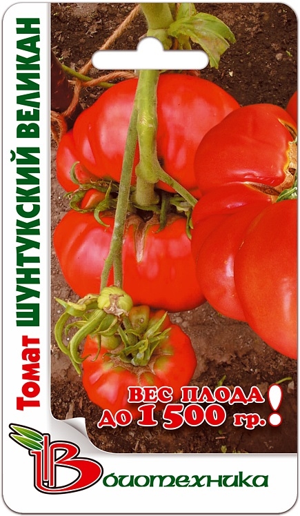 Семена томата "Шунтукский великан" (Shuntukskij velikan) превращаются в среднерослое растение, которое дает богатый урожай очень крупных плодов. Средняя масса помидорок может достигать 800 грамм. Нередко бывают случаи формирования томатов более 1,5 кг. Плоды многокамерные, плоскоокруглой формы. Мясистая мякоть красного цвета обладает отличными вкусовыми качествами. На нижних соцветиях плоды могут быть малосемянными или даже бессемянными. При выращивании в теплицах куст требует формирование и подвязки. Рекомендуется использовать плоды в салатах.
