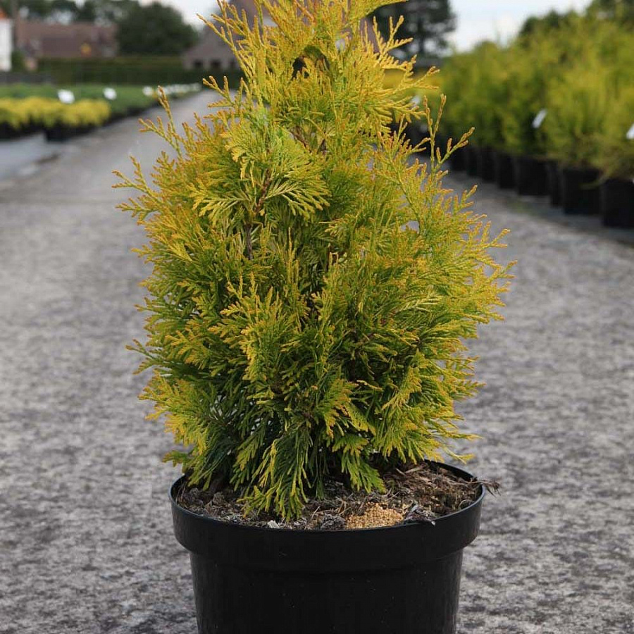Саженцы туи западной Еллоу Риббон (Yellow Ribon) высоко ценятся за свой интересный золотистый окрас хвои. Таким образом, можно создать необычную жёлтую аллею или изгородь, применив, как вариант, крупномеры Yellow Ribon.