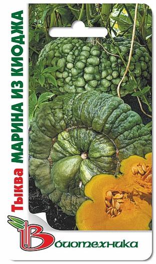Семена тыквы "Марина из Киоджа" (Marina iz Kiodzha) высевают на рассаду в конце апреля. Высадку на постоянное место проводят в мае. Также семена можно высевать непосредственно прямо в открытую почву в конце мая. Созревании плодов наступает на 130 дней после появления массовых всходов. Плоды формируются серо-зеленой окраски, большие, плоскоокруглой формы, весом 10-12кг. Мякоть толстая, плотная и сочная, сладкая на вкус, желто-оранжевая. Семенная камера небольшая. Сорт хорошо сохраняется и транспортируется, не теряя при этом вкусовых и товарных качеств, за что и получил большую популярность.